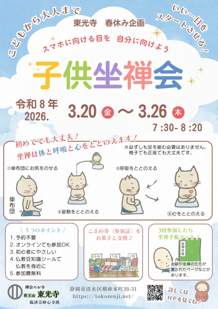 | 東光寺の子供坐禅会を臨済宗青年僧の会のオンライン坐禅会として生中継しています。 遠方で参加できない、送り迎えができない、など様々な理由でお寺に来ることができない場合、パソコンやスマートフォンがあれば一緒に坐禅をすることができます。オンラインでの参加もお待ちしています! 参加方法等は臨済宗青年僧の会ホームページ・オンライン坐禅会をご覧ください。 ![]() |
